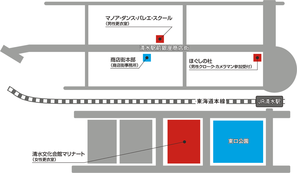 従って、当実行委員会としては、ご自宅などでの着替え後、イベント会場に行くことを禁止することはできませんが、イベントの継続的な運営および安全確保のため、近隣のホテルおよび清水駅前銀座商店街内の清水ノンタウン様のご利用者を除き、できる限り更衣室の利用をお願いしております。